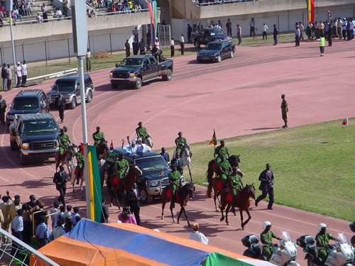 | The arrival of the 2 presidents into the stadium. Note the motorcade (best cycles in the Gambia by far) and US style secret service in suits running alongside. |