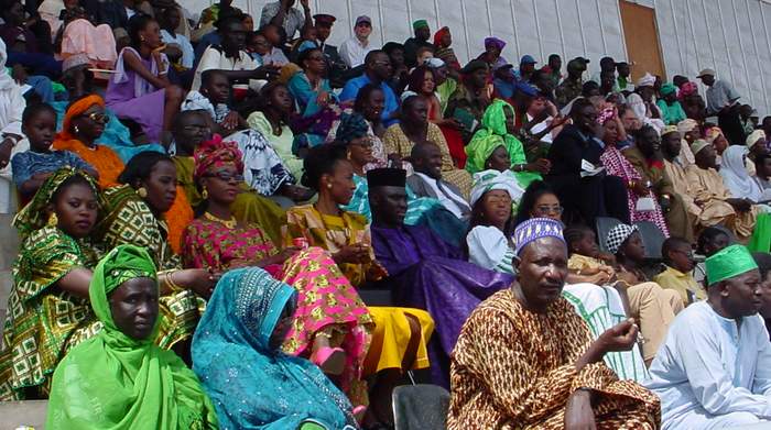 Monday, Feb 18, 2002 Kate got us VIP tickets to the 37th anniversary of the Gambia's Independence from Great Britain. We were sitting in the main section of the National Stadium, on individual chairs, under a sun shade (after 10 pm, when the sun was high enough in the sky to be blocked. We got there about 9:30 AM, and left about 2 pm. For Gambia, it started remarkably on time - only about 30 minutes late. For most of those there, however, this was a long time to be in the sun, and many fainted and had to be carried off by the Red Cross To read what the Observer had to say, click here. The President of Senegal visited and participated, along with the President of the Gambia. In the photos below, President Jammeh of the Gambia is in white, and the Senegalese President is dressed in blue. First there was a parade of arriving dignitaries, including the female vice president, all in humongous SUVs. Then the 2 presidents arrived in their motor-cade. Next there was a review of the military units of the Gambia - the army is only 1000 strong, so we saw representatives from the police force, immigration service, prison guards, and fire departments as well. They did several different marches around the stadium while various military bands played. They ended by firing a salute. The review concluded with the Gambia's one jet fighter flying by the stadium - definitely the crowd's favorite! Next representatives from about 70 local schools and voluntary societies marched by. Finally, President Jammeh delivered his annual speech on Independence day. See the Observer (above) for a synopsis (the accoustics were poor).We met the Army PR officer acting as MC during the first half of the event, so we now have a friend in the Gambian Army who's promised to show us around. You can also see how colorful the other VIPs dressed. Back to Main News Page Back to Our Homepage |