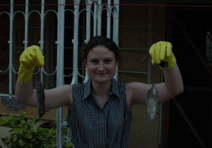| Saturday Feb 9, 2002 We're delighted to inform the public that we have solved, at least for the time being, our rodent problem. We were too tired the first night we moved in to notice them-but we did hear lots of strange noises, and in retrospect, some of them must have been the rodents. We could not help but notice a hole the size of a D cell battery in the bottom of our screen door. So we dutifully taped it up and didn't think much more of it. The next morning, we heard lots of noises, found a hole in our bread, and lots of droppings under our bed! Not to mention a new hole on the other side of our screen door! The locals here use glue traps-so that's what we dutifully bought. The directions say to spread it out on cardboard, and place it in areas where the mouse travels. What they didn't say was how to secure the cardboard! We woke up later that evening to the sound of the large mouse/small rat dragging our cardboard around the house! He got free, and traipsed about leaving glue paw prints all over the floor. He even ate the bread that was surrounded by glue! More droppings under the bed-as if coming to spite us! The next night we shut the back door to prevent him chewing another hole in the screen door. All well and good, except we woke up to seem him chewing a hole through the screen in our bedroom window! When fixed in our flashlight beam, he jumped down-we couldn't decide whether into our room or outside the house. So we decided to close our bedroom window-only to then realize that he was indeed inside, and now locked in our house- in fact under our bed! We chased him around with a broom for a while, and eventually persuaded him to spend the night in the kitchen instead. Tricky, as the doors all fit so poorly that there is about a 4 inch gap under every door-which we filled up with cushions from our easy chairs. The next day VSO sent an exterminator around-he left several poisoned treats under our furniture. It took another day (and a sleepless night listening to the rats and chasing them about with the broom) but we were rewarded Thursday night when we came home from work with 2 dead rodents in our kitchen! And our maid found another one the next morning. We think a fourth may have met his demise in the drain pipe out back. But no more holes in our screens, and we've been getting loads more sleep these days! We don't leave any food lying about, but for now we're keeping our fingers crossed! |