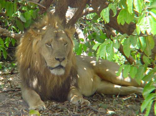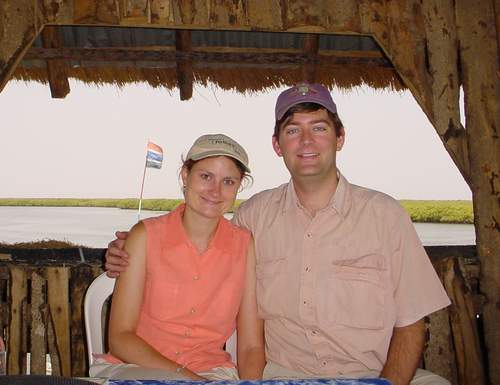 | After a long hot walk through the nature reserve, we were hungry and tired. Here we are relaxing at Lamin Lodge. You can just see the river (still salty) and mangrove swamp in the background. |