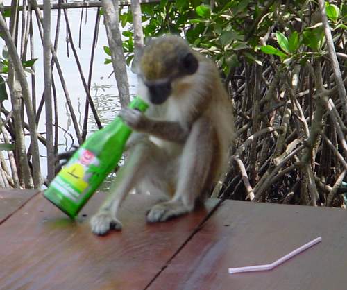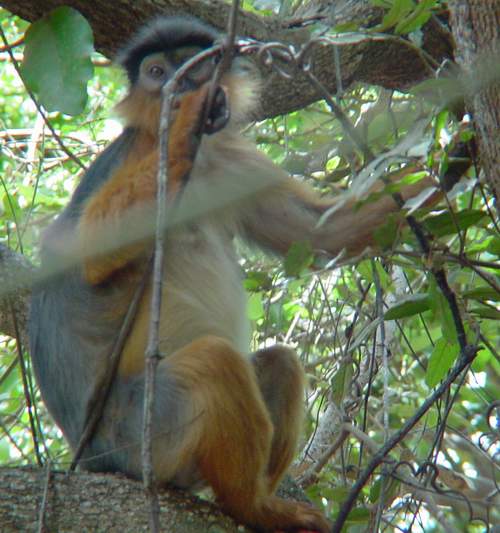 | Here is the elusive red monkey. He was up in a tree, about 10 feet above us. His front is red, his back is greyish brown, and his head almost black. In contrast with the smaller brown monkeys, they are quite shy. |