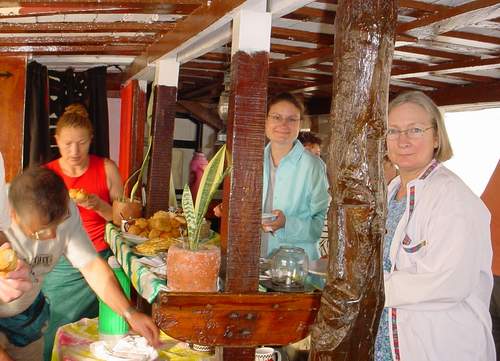 Here's the view from the bow deck looking back towards the stern.  During the day, we sat on the top deck and watched the riverbank pass by, and night we slept up there as well.  We ate meals below on the main deck.  Besides us 4 Holdsworths, there was an other VSO and his family, an APSO (Irish) volunteer and her sister, and 5 German tourists (including one 3 year old, who, however well-behaved considering, was too young to be afloat!)
