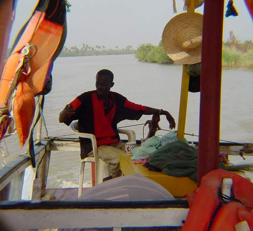 Here's our excellent cook, taking his turn at the helm of the Alhagie.  Given all the sunbathing Tuubaabs in front of him, its a wonder we didn't hit anything!.