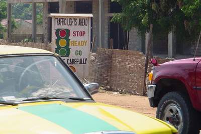 | Believe it or not, the Gambia only has one traffic light - and this was only installed a few months ago. Here's the signe just before the intersection trying to instruct drivers what to do when they see it! People drive better than might be expected, but biking still an adventure! |