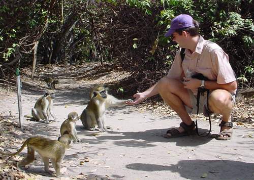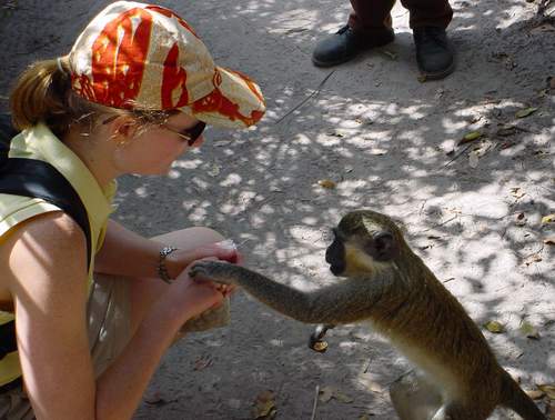 | After the slaughter of the rams, we escaped to the nature park. Here Kate is greeted by the local green monkey troup. They love peanuts, and will take them right out of your hand. Very gentle - and they really do have little hands, just like ours! |