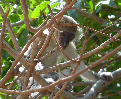 | Aren't they cute! We spared you pictures of the red monkeys, because since they were too scared to come down from the trees, the pictures aren't too clear. Here's a baby green monkey up close and personal. |