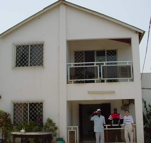 | SDF is in an old converted bungalow house. Virtually every office has a bathroom with tub or shower off it! Here Kate poses with a colleague and one of the security guards (saluting). |