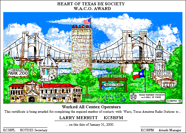 you have contacted along with your QSL card. Stations within thirty miles of Waco count also.