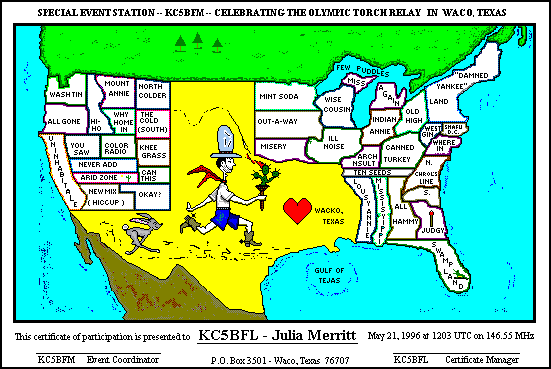 The above is a likeness of the certificate for the Olympic Torch Relay Special Event. The story about this certificate and the log will be posted later.