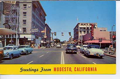 What about the film's impact here in Modesto? Its local premiere at the Briggsmore Theater on 21 November 1973 was a special event. It served as a fund-raiser for the Central California Heart Association and was also used to honour Lucas by giving him the key to the city. The film's enormous success later inspired a revival of early 60s cruising culture in the city. Local historian Colleen Stanley Bare writes: "Modesto became famous for its Graffiti Nights during a 15-year period from the late 1970s into the early '90s... (c)elebrated on the Saturdays following high school graduations...What started as a simple local festivity soon became a law enforcement nightmare. It attracted cruising devotees from all over the country, and at its peak, Modesto's downtown streets and McHenry Avenue were jammed with more than 100,000 cruisers and spectators... (W)hen the city's cost for extra police protection and clean-up totaled more than $150,000 per event, Graffiti Night was banned in 1994." |