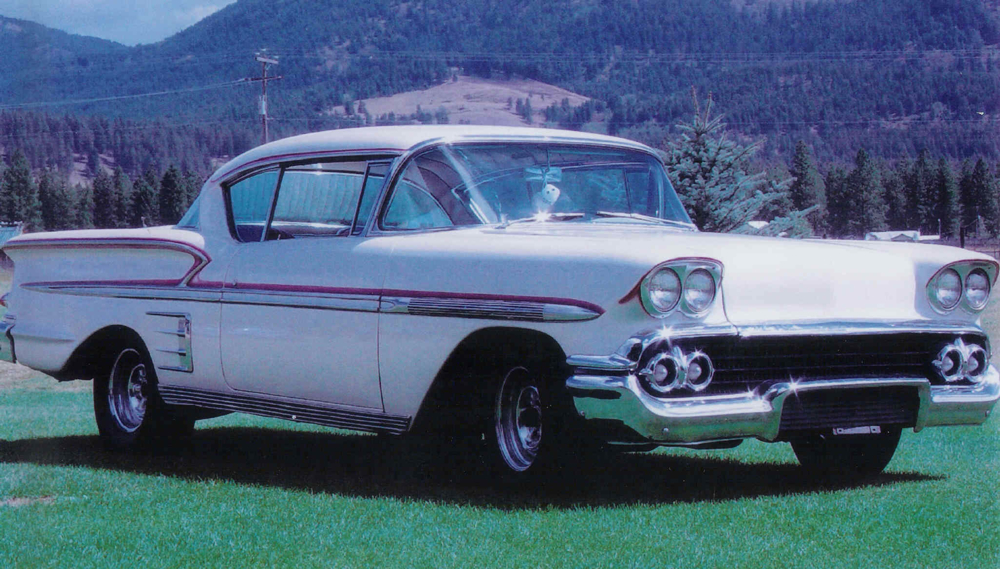 | All the Graffiti cars are representations of some of the superfine machines driven by local hot rodders back in the day. To this writer, The '58 Impala in American Graffiti is the best of the movie cars. Not too flashy in its looks but not meek in any respect. Its simple white color gives it a somewhat stock appearance but the custom red trim and the extended taillights on the car's rocket-like tail fins highlight its unique nature. Co- producer Gary Kurtz bought the car for the film in the Los Angeles area. It's complete red and white tuck and roll interior was the thing that attracted Kurtz to it because the original script makes a reference to the tuck and roll upholstery in Steve's car. Once it was purchased, the car was handed over to Henry Travers, who sent the Impala to Close and Orlandi's body shop in San Rafael, where the metallic blue paint was quickly covered with an appliance white paint job and some red fogged accents around the bodylines. A set of chrome-reversed wheels was added. Although in the film Terry brags that the car's engine is a 327 mill with 6 Strombergs, in reality, the '58 Chevy was powered by a stock Super Turbo-Thrust 348 and a 3-speed Saginaw transmission. |