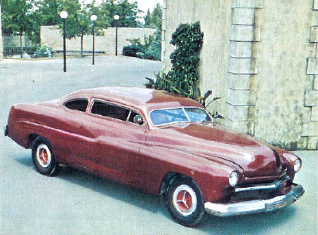 | Transportation Supervisor, Henry Travers first saw the 51 Mercury coupe; in its original form, in the spectator's lot at a stock car track near Sonoma. It had the same wheel-covers and whitewalls that appeared in the film. However, after it was purchased it too was taken to Close and Orlandi's where it was prepared for the movie in a slap-dash manner. The car was made to look good on film only with no regard for practicality or function. For example, rather than cut the rear window to fit the new 4" chop job, the stock piece of glass was just slid down into the body panel and covered up with bondo and paint. The side-rear quarter glass and wing windows were simply removed and the door windows were left rolled down during filming. The headlights were frenched by simply bondoing the headlight trim rings to the fenders. The original grill opening was rounded and a spare bumper lying around the shop provided a makeshift grill bar. Many of the weld seams from the chop job were left exposed in the interior and can be spotted in the film. Finally, after the hood, trunk and doors were shaved, the car was painted Cimarron red. All the modifications were done within the span of about 2 weeks. |