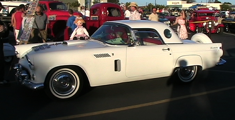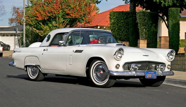 The story of the famous movie car dates back 8 years before production began. Owners Clay and May Daily originally bought the Thunderbird convertible in 1964 from a used car dealership in San Bernardino, CA. They paid $1,000 for the used car, ( A new one in '56 retailed for about $3,100). At the time of purchase the car's stock white color had been re-painted Fiesta red. When the Daily's moved north to Petaluma, CA, the car was hit from behind. When the car was repaired the Daily's had it re-painted to it's original color, white.