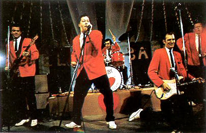 | (left) Flash Cadillac & the Continental Kids [Herby & the Heartbeats], normally dressed like Greasers for their retro-50s act but Lucas had them wear matching suits for the sock hop scene in the film. |