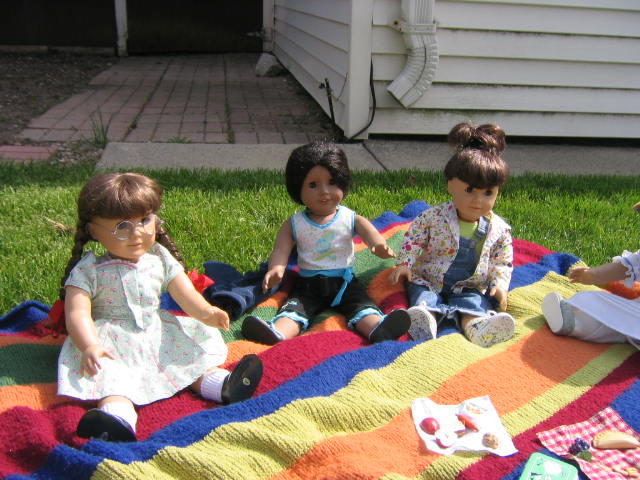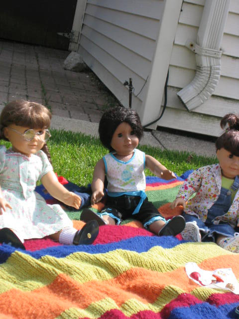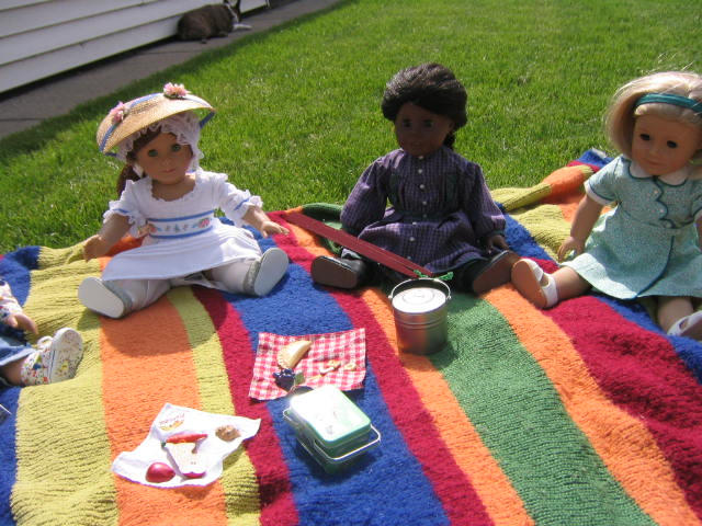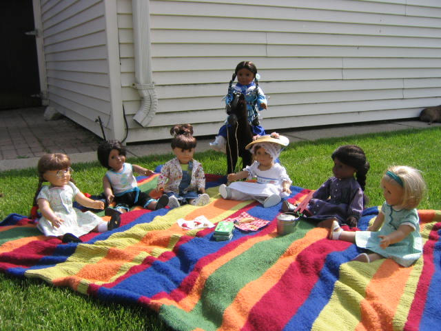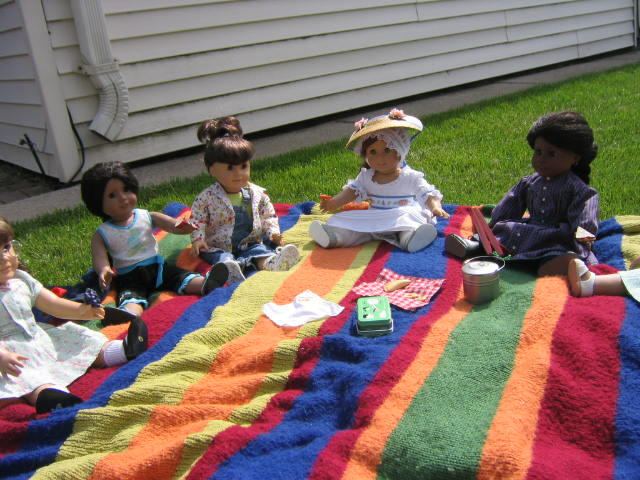 I took Arabella (Liz's traveling doll) and some of my girls outside for a picnic.