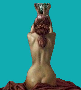 Slowly bring the vessel up your inner thigh, up past your belly (many girls will be seen pausing at their bellies for three beats of the Gorean moons although this cannot be easily referenced in the scrolls), past your chest and bring it to rest against your heart. Often a prayer is offered for the Master or Mistress, but this is not standard. Kiss the side (not the rim) of the vessel. Lower your head and lift the container between your arms upward."Then I knelt naked before him, head down. "You may now serve the paga," he said. "Yes, Master," I said. I reached to take the cup, in both hands. One kneels, one proffers the cup, head down, with both hands, to the male. (Slave Girl of Gor, pg. 305)9. Speak and Offer