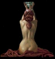 with the tall, graceful, silvered pot containing the black wine. She was