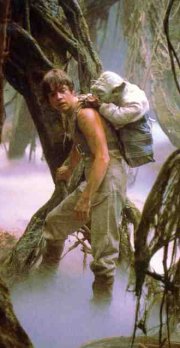 | Though Commander Skywalker had become a respect- ed figure in the Rebel Alliance, it was not easy going for the young Jedi. On a mission to scout the frozen plains of Hoth, Luke was attacked by a wampa ice creature after spotting what he thought was a meteor impact. The 'meteor' was actually a probe droid, which relayed the location of Echo Base to Darth Vader. However, Luke was in no position to investigate: the wampa knocked him un- conscious and dragged him back to its lair. Hanging upside down in the wampa cave, Luke awoke, and attempted to free himself, but to no avail. It was only after he stopped trying to escape, and let the Force flow through him, that he was able to grab his lightsaber and cut himself free. The Force could do little to protect him against the harsh climate of Hoth, and soon Luke was close to death after staggering around in the endless snow plains. He thought he saw a vision of Ben Kenobi, instructing him to seek out a Jedi Master on Dagobah, but he soon fell unconscious again. Luckily for Luke, Han Solo had arrived in time to save him and ensure his return to Echo Base. Luke was treated for his wounds, but his recuperation was cut short. The Empire had launched an assault on Hoth, and Luke was needed as part of the Rebel's defences. He led Rogue Squadron, flying modified T-47 airspeeders, against the Imperial assault walkers. Though Luke's tactic of tripping the walkers with tow cables proved sucessful, he was shot down and Echo Base was overrun. Luke managed to reach his X-wing as the remnants of the Rebel defence fled Hoth. Luke fled also, but he was not heading for the Rebel rendezvous as he had been instructed. Instead, he flew to Dagobah, to seek out Master Yoda. Though Luke was glad to find Dagobah actually existed, he was not so happy upon landing on the planet; since his landing submerged his X-wing in one of Dagobah's many swamps. He retrieved his equipment and set up a camp, while wondering just what to do next. The answer found him, in the form of a little green creature, insistent, it seemed, on irritating Luke and Artoo. The creature's persistance led Luke to its home, where Skywalker realized the being was, in fact, Yoda, after it began talking with the disembodied voice of Ben Kenobi. Thus began Luke's Jedi training at the hands of Yoda. Luke's skill in the Force grew, even though he was still far from becoming its master. He failed one of Yoda's tests by allowing his fear to manifest itself as Darth Vader, and later failed to raise his X-wing from the swamp. Yoda chided him on his insistance to try, rather than to do. Though Luke was beginning to understand what Yoda meant, his recklessness cut the training short. After recieving a vision of his friends in pain on Bespin, Luke left Dagobah, despite warnings and protests from both his Jedi mentors. On Bespin, Luke realized why his teachers had warned him: Darth Vader had set a trap to lure Luke to him via his friends' pain. Skywalker and Vader duelled on Cloud City, and though Luke was able to hold his own in the initial stages of the battle, it didn't last. Beaten and weary, Luke was forced onto a gantry overlooking a vast reactor shaft. Vader attacked relentlessly, and eventually severed Luke's right hand, sending it and his lightsaber into the shaft. Then came the biggest assault againt Luke in the fight: Vader revealed that he had not slain Luke's father, as Ben had told him...he was Luke's father. As the shocked and confused Luke listened, Vader implored his son to join him on the dark side. He stretched out his hand for Luke to clutch onto, but Luke did not. He chose to fall to his death than fall to the worse fate of joining the dark side. Luke was sucked into an exhaust pipe and dropped out of Cloud City's underside. Hanging on to a weather vane for his dear life, Luke called to Ben through the Force. Knowing he would not answer, Luke called to Leia. Somehow, she heard his plea, and ordered Lando to return the fleeing Falcon to Cloud City in order to save Luke. He was brought on board, and after a narrow escape from Vader's Super Star Destroyer, they met up with the rest of the Alliance. Luke was given a new hand, and stood with Leia and the droids, watching the galaxy spiral below them, contemplating their future. |