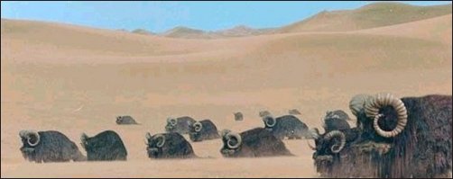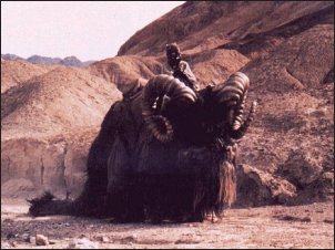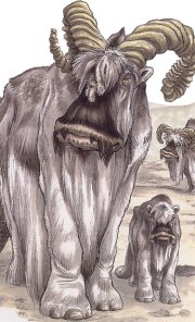 | Just how the shaggy banthas managed to survive on the arid desert world of Tatooine was a mystery, though the hardy beasts of burden were certainly welcomed there. Banthas were not giant creatures - they stood at about 2 meters tall - and thus could be ridden easily. On Tatooine, Tusken Raiders domesticated many banthas to use them as mounts. The woolly creatures were able to cross the deserts and canyons of Tatooine with ease. Banthas were also used in cities and settlements across the planet as pack animals. Another use for the bantha came from its hide and its milk; bantha meat and milk were considered rare food items, while jackets, boots and other clothing could be made from a bantha's hide. As banthas were found throughout the galaxy, their physiology and behaviour changed depending on their environment. While usually docile, there were a number of feral banthas that proved to be very dangerous. While all banthas were herbivores, their sharp horns and trampling feet posed a danger if the beasts became startled, agitated or if their young are threatened. As they travelled in herds, such rampages were all the more dangerous. Bantha herds consisted of up to twenty-five individuals, led by the oldest, strongest female. A herd which grew too large split, with the second oldest and strongest female leading the new herd. The average bantha could live more than eighty years; the banthas of Tatooine were known to form deep bonds with the Tusken Raiders, and as they could well outlive their riders, they would often commit suicide if their Tusken owner were to die. Banthas which died naturally were placed in vast graveyards, which held a ceremonial reverence with other banthas. These graveyards were defended fiercely by the beasts. |