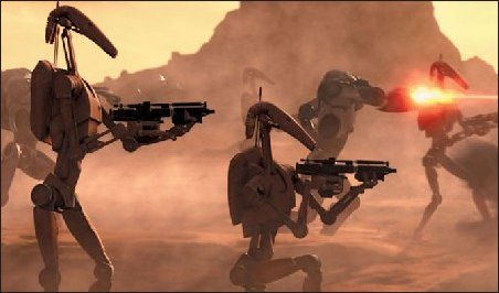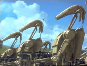 | The soldiers of the Trade Federation were immune to the emotional effects of battle, they never shied away from duty and fought to the death. These were not elite shocktroopers but mindless droids, created purely for battle. Yet the battle droids employed to protect the Trade Federation had many flaws that sentient soldiers overcame. Being manufactured drones helped in many ways, but it was also the failing of the battle droids. They were produced in a way that ensured quantity over quality, so while the droids' strength lay in numbers, they were weak and possessed poor artificial intelligence. The droids were commanded by a Droid Control Ship in orbit, or a control device on the planet, and could thus be shut down or tampered with easily. Even in battle they were easy to destroy; weak armour and a poor aim meant the battle droids didn't survive very long in a warzone. Though it seemed as if the Trade Federation rushed the battle droids out on a cheap budget, it was not the case. The droids had top of the range sensor packs mounted on their backs, which carried the neccesary equipment for Neimoidian controllers to relay instructions to their troops. They were designed to be stored in compact, fetal positions when not in use, so a large number could fit aboard transports and drop ships. The battle droids were introduced when the Trade Federation called for extra defences against pirate attacks. Along with the Federation's other defences, the battle droids were soon used in offensives; they were deployed to invade Naboo during the Federation blockade of the planet, and later to attack the Gungan Army tasked with luring them from Theed City. However, the droids were shut down when the Control Ship in orbit was destroyed, and the Trade Federation was ousted from Naboo. The Republic prohibited the further use of batte droids, but later found the Federation - and other members of the newly-formed Confederacy of Independant Systems - was still creating them in secret. Advanced battle droids which had multiple control sources were deployed on Geonosis, but again their strength in numbers failed when the Army of the Republic attacked. The battle droids were unable to defend against such a powerful force, and were once again rendered useless. Though they fought in the Clone Wars, the battle droids became obsolete with the introduction of the Empire and its infamous stormtroopers. |