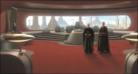 | Built after his election, the great Republic Executive Building served as Supreme Chancellor Palpatine's office during his time as leader of the Republic. Located near to the Senate chamber in the govermental district of Coruscant, the Executive Building was a large dome-like structure surrounded by office towers and senatorial residences. Huge semi-panoramic windows looked out over the city, reminding senators meeting there that their decisions would have wide repercussions on the Republic. Palpatine's red-hued office was situated within the building, and held many important meetings during his time as Chancellor; Palpatine's loyalist committee would convene in the room, and senior members of the Jedi Council often discussed events with the Chancellor there. Palpatine usually reclined in a seat of office that included a secret shield generator at the base, after public fears for his safety prompted extra security. His desk faced the door, which was flanked by two of his red-robed guards. When discussions were held there, chairs were arranged in the office, but a holoprojector was also a feature of the room. Palpatine adorned his office with various statues kept from his days as a senator. At some point during the Clone Wars, the office was extended to take in an additional circular side room to cater for the Chancellor's new powers. |