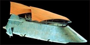 | When an opulent palace and vast wealth just wasn't enough, the Ubrikkian luxury sail barge made sure a Hutt had the best, most comfortable ride to be seen in. The Ubrikkian sail barge was a huge, repulsorlift pleasurecraft which could be used over water, sand or any relatively flat surface. It could reach speeds of one hundred kilo- meters per hour, with a maximum flight ceiling of ten meters. However, by relying purely on the massive sails atop the craft, the sail barge could cruise at a leisurely thirty kilometers per hour. These sails could also be retracted when required. The Ubrikkian sail barge needed a crew of twenty six to operate, and could hold up to five hundred passengers and two thousand metric tons of cargo. Though some sail barges were modified to provide extra defence for their wealthy owners, the Ubrikkian model came equipped with a single heavy blaster cannon. Sail barges became the preferred mode of transportation for the Hutts. As well as providing them with a luxury transport for them and their retinue, sail barges were easy to customise for their huge bulk and huge needs. In fact, many customers brought only a sail barge chassis, in order to completely customise it. Once such customised barge was owned by Bogga the Hutt: he managed to create a spaceworthy sail barge, and used it to travel through the Stenness system. Other Hutts had less grandoise barges, such as Jabba the Hutt, whose sail barge, the Khetanna, was used to negotiate the deserts of Tatooine. |