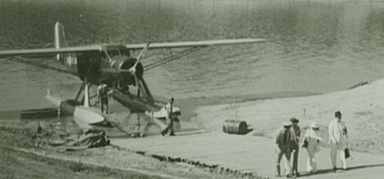 Desembarque de pasajeros de un Stinson en un río de la Selva Peruana.