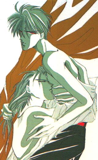 Well, that's a story of a singer (Koji, the man with long hair) who falls in love with a guy (Izumi, the other) who helps him and who accepts to make love with him a long time after their meeting. Not so original, except that they are two men and that in a special collection the author draws very hot sex scenes....I'm not really interrested in yaoi's story but I find them cute. The singer seems so desperate. Izumi hesitats so much before making love with him. I love tormented and tragical stories...well that's all. |