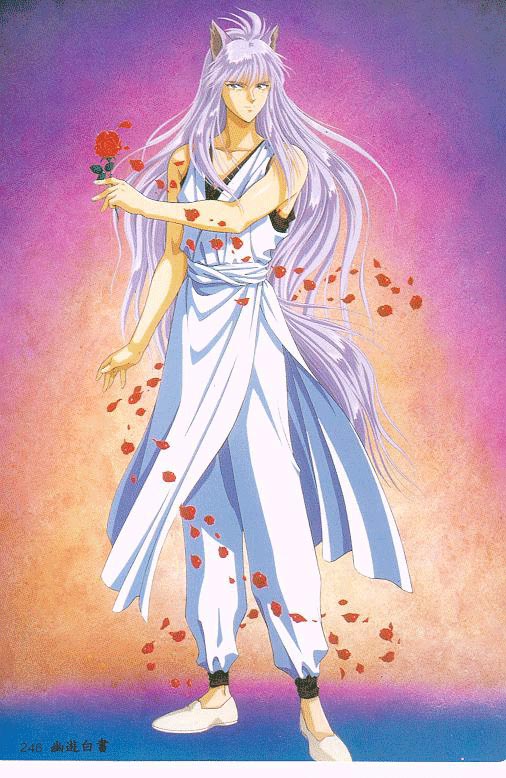 Kurama is a character from Yu Yu Hakusho (yeah, the first one who is not drawn by Clamp in this classification!!!!!). He's 400 years old, he is a youko (a fox spirit) and he was a thief but he was hurt by hunters and then he had to be reincarnated in a human foetus, that's why he has two form. In this text, I will speak about his youko form (for his human form take a look at my cute boys). He has long silver hair, golden eyes, silver fox tail, fox ears (they are so cute!!!!), he's really much taller than in his human form and his so handsome!!!!! I don't know very much about this form because I only read eight volumes of the manga (and he's not appeared yet) and I haven't seen the TV serie (we don't have it in France, and we don't have Fushigi Yuugi, we don't have Gundam Wing, we don't have Samourai Troopers, we don't have Ruroni Kenshin, we don't have ....etc....I HATE french TV......) but I read he's crueller (that's not really difficult...). Kurama can control plants and his favorite weapon is the rose whip. He's a great friend of Yuusuke, Kuwabara and Hiei (some people say he may be in love with the latter, I don't know but I think they could be so cute together!!!!!) , the other heroes of Yu Yu and together they have to fight spirits or things like that (if you want more details read the manga, watch the anime (if you are lucky enought to have it) or explore all the wonderful sites about it on the net.....).