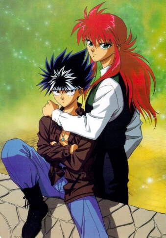 What can I say about them??? There is nothing to say about them (I write that at the beginning and after I write a very long text)....Just look at them...They are so cute together!!!!!!! Kurama is so cute in his human body with his long red hair and his huge green eyes. And his so nice and so polite....Just the kind of boy I dream about (I can always dream......). On the contrary Hiei is small with strange black hair and worrying red eyes and he's very rude but so cute too!!!!!! They are really a strange couple. Just at the opposite of each other. In fact in the serie they don't appear as a couple....but, according to some persons, there are some hints (as far as I'm concerned, for the moment, I saw nothing at all but they are just so cute together that all is allright for me). They met before the beginning of the serie. Hiei believed that Kurama was one of his ennemy (he was looking for Yukina, his sister) and tried to kill him. But after, when Hiei realised that Kurama was not a danger for him they became friends (and more with the time.....). Then, as they were both robbers they made a team with a third guy and then they met Yuusuke (if you don't know what happened next, read the manga or watch the serie, I'm too lazy to write a story you can read everywhere on the net,YuuYuu Hakusho is not the topic of this article). Anyway, they are always together and very concerned by one another. That's why they are so cute together!!!! |