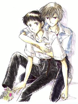 real friend. He has to fight in an Eva to save the Earth which is threatened by strange creature called angels. At a moment where things are worst than ever, he mets another Eva pilot, Kaworu who becomes his friend and more... (Kaworu tells him he loves him, takes his hand in the shower, they sleep in the same room...) But in fact, Kaworu is an angel and Shinji has to kill him and that will traumatized him. Latter, he will tell Misato (his chief) that for the first time someone told him he loved him, and he said that he loved Kaworu too... Snif... That's such a tragic story... Shinji and Kaworu where soooo cute together!!! |