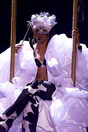 The Cut The Cut aired on MTV from fall '98 to January 1999. Although it only lasted one season, The Cut was one of MTV's #1 shows, and it brought back MTV's urban audience, which had been declining over the years. Left Eye hosted the daily half hour long talent show, alongside three judges made up of recording artists, deejays, producers, songwriters and record label CEO's; as well as the four unsigned musical acts that performed, competeting for a chance to shoot their own music video to air on MTV. Judges included Wanya Morris of Boyz II Men, Montell Jordan, Tamia, Tatyana Ali, KRS-1, Ice-T, Dru Hill, Big Lez, Angie Martinez and Kurupt. I used to watch The Cut everyday and Left Eye was the bomb on it. Everyday she had some crazy ass outfit or hairstyle, but her clothes waz always mad cute. She was loud as hell (she ain't even need her mic) with mad personality, as usual. She seemed like she loved hosting The Cut, and it kept her visible during the time TLC was away. Tha winner of The Cut was rapper/singer Silk-e. She made a video for her song "Respect" but I hardly ever seen it on. All I know is, that show was bangin' and I loved getting to see Left Eye everyday. The 1999 Source Hip-Hop Awards In August 1999, Left Eye co-hosted the Source Hip-Hop Awards with Treach from Naughty By Nature. It was her first award show, and she rocked it. She wore two different outfits, both designed by her uncle, Kyle Young. The first was a brown suede and fur ensemble (you can see it in the pictures at the left), and the second was silver, black and see through in spots (you can see that one in the pictures as well). I liked that one better, even though I thought they were both mad cute. Left Eye did more of the hosting than Treach. She looked mad pretty as always and did a really good job. Left Eye just has got what it takes to host, because she always seems like a natural at it. She was funny without being too obnoxious and as always had a lot of personality. She said later that she really enjoyed hosting it and she thought the show as well as the performances were great. Speaking of performances, performers included Nas, Sean "Puffy" Combs, DMX and the Ruff Ryders, Jay-Z, Juvenile and the Cash Money Family, Master P, Silkk the Shocker, C-Murder, Mystikal, and Outkast. The 2000 Soul Train Awards Left Eye co-hosted the 2000 Soul Train Awards along with soap star Shemar Moore, and R&B singers Tamia and Eric Benet. She also performed the hit single "U Know What's Up" with Donell Jones. However, their performance didn't go as smoothly as they probably would've hoped. First, Donell Jones was having mic troubles. His mic kept cutting out while he was singing throughout the entire performance. Then, Left Eye was lowered onto the stage on a swing type thing, covered up by a white coat and a white feather mask (see the pic to the left). When the swing reached the stage, she pulled off the mask and went to remove her jacket, but before she did she realized that the li'l thong thing she had on was coming loose. She quickly turned her back to the audience struggling to fix it - the camera men backstage tried to film her and she started shaking her head no and trying to turn away from them, too. I felt so embarassed for her but I was laughing any ways. She had to stand there and do a good part of her rap with her back to the audience 'til she finally got shit straightened out. Then she turned around and took off her coat and the audience started cheering. She only had a few lines of her rap left, but she made the best of it. In addition to her performance outfit, Left Eye rocked two other mad cute outfits. Her first was a l'il low cut black top and a red wraparound silk skirt with a matchin beaded necklace. The last outfit was a lavendar jacket with a feather collar, and matching short-shorts and boots. Her hair was in some crazy style as usual - tri-ponytail braided hair pieces with these big rings in them. Her hosting went a lot smoother than her performance, but I do got one complaint - they didn't use Left Eye enough for hosting, they used Shemar Moore, Tamia and Eric Benet more often. Maybe it was because Left Eye got a lot of airtime from her performance and acceptances for the two awards TLC won, but still it ain't fair. Oh yeah, speaking of acceptances, mad people was talking about how Left Eye thanked just about everybody (including her hair stylist and makeup artist) except T-Boz and Chilli when she accepted the group's two awards. However, no one even bothered to ask why the two didn't even show. About the whole situation, Left Eye has said, "Actually, the first thing I said was I would like to accept this award on behalf of TLC. And that was thanks enough I thought. But everybody wanted to make a big deal out of it, but it's understandable, and I expect someone to say something about it, you know, and that's what it ended up being, so whatever, everyone's gonna find something to talk about." Aight then. The 2000 MOBO Awards Left Eye co-hosted the 2000 MOBO Awards with DJ Trevor Nelson. The awards took place in Britain. In addition to hosting, Left Eye performed "U Know What's Up" with Donell Jones. Many people didn't think Left Eye was gonna come through to host, since her very public "disappearance" happened only a short time before the awards were scheduled. However, it's been said that the disappearance of Left Eye and her boyfriend at the time Sean Newman waa actually to promote the MOBOs with a contest - it was something like if you found them or spotted them you could win a free trip to the awards - but I'm not sure of this I only heard about it. Anyway, the MOBOs really weren't all that. Left Eye looked beautiful in several fly outfits, but the dialogue they had her sayin' was kind of weird and pretty corny. She seemed a little awkward saying the dumb jokes they wrote for her, but she did her best to pull it off. One of the highlights of the show, however, as when an achievement award was given 