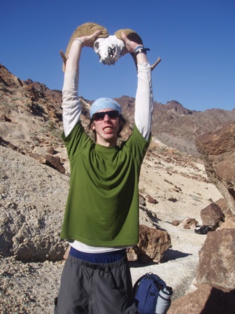 | Photo by Steve Engle One of Patrick�s greatest achievements on our trip to the Mojave Desert, Nevada was tracking, catching, and skinning a bighorn sheep alive! Above, he triumphantly raises his prey�s remains above his head and celebrates his victory� Ok, ok. So maybe Patrick had a little help from a mountain lion and years of decay to happen upon such a beast. The true accomplishment here though was being able to see and interact with the natural world on an up-close and personal level as we did on our 8 day outing to the desert during our Winter Term 08 Outdoor Leadership class. Where else are you going to be able to discover and examine a genuine bighorn sheep skull without a museum curator bellowing, DO NOT TOUCH! |