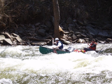 | Photo by Steve Engle Taking on one of the most challenging rapids of the entire Whitewater Boating course, Patrick (bow) and Tim (stern) chose the most difficult route which left them careening smack dap into giant wave trains and massive hydraulics, and ultimately resulted in a very soggy canoe. Challenging? To say the least! In reality though, the bigger challenge may have been collecting all the bags, canoe paddles and gear floating down the river. |
