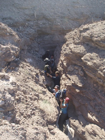 | Photo by Kevin Stitzinger On our trip down the Colorado River through Nevada and Arizona, we were presented with multiple challenges, one of which was squeezing through narrow crevasses carved through the desert�s rock chasms. Sucking it all in and lifting out bags above our heads was only half the challenge though. For little people like me, it may have been easier to squeeze through the narrow passages, but climbing out of them was an entirely different story. |