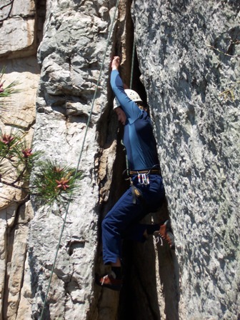 | Photo by Kevin Stitzinger I can say from my own personal experience that rock climbing is one of the most challenging activities we offer through D&E�s outdoor resources. Having participated in the Wilderness Adventure Club climbing outings, I came to the realization that rock climbing doesn�t just involve your arms�it involves your entire body and mind. And needless to say, both my body and head were exhausted for about a week after my first real rock climbing experience. In addition to WAC�s rock climbing opportunities, the Outdoor Physical Education class has also been involved in such activities. Above, Matt Fannon works his way up the face of Seneca Rocks. To parallel my own physical and mental challenge, he notes �Adventures such as Rock Climbing are a good strain on the body, but a perfect way to challenge yourself both physically and mentally.� |