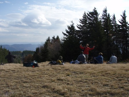 | Photo by Kevin Stitzinger Caption by Bill King Out on the Outdoor Resource Center-sponsored trip, "Hike for the Health of It," Dr. King leads an awareness journaling exercise based on a stanza from an Emily Dickinson poem: "The brain is wider than the sky, For, put them side by side, The one theother will include With ease, and you beside." |