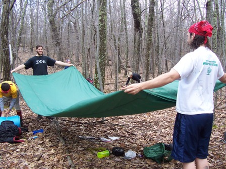 | Photo by Laura Bonser Our camping trip along the North Fork Mountain in the spring of 2006 provided multiple opportunities for us to experience the true meaning of teamwork. Shortly after dark, we were hit with a torrential downpour, coupled with thunder and lightening. Since it�s not exactly safe to be on top of a mountain in a giant thunderstorm, we had to work together to communicate with one another in the dark as we traversed down the mountain to a lower elevation. It was solid teamwork that allowed us to weather the storm unscathed, and it provided us with an experience in the woods that I know we�ll never forget. |