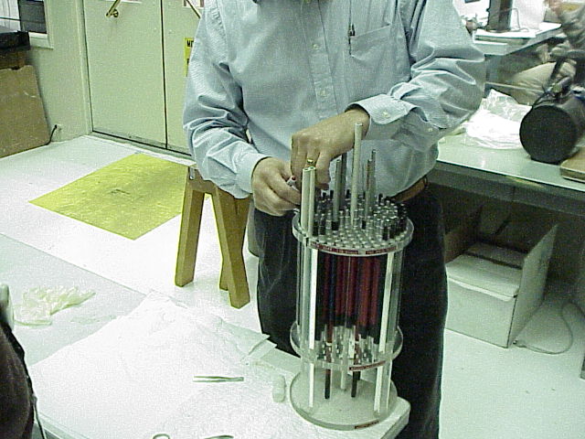 A 1/3 scale model of the reactor core. Each fuel rod is about 2ft long made out of 30% pure Uranium 235. The control rods are made out of Boron Carbide.