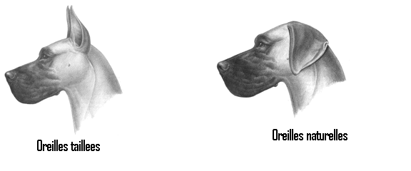 | Oreilles Attachees haut, pas trop distantes l'une de l'autre, de grandeur et d'epaisseur moyennes, flechies vers l'avant pres de la joue. La ligne superieur de l'oreilles flechie doit etre a peu pres au niveu du crane. Orreilles coupees : attachees haut, pas trop distantes l'une de l'autre, bien pointues mais toujours en proportion de la forme de la tete et portees raides et droites. Defauts : Oreilles repliees sur le cote comme chez le foxhound. |
