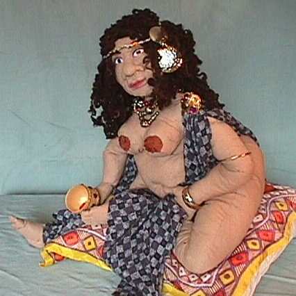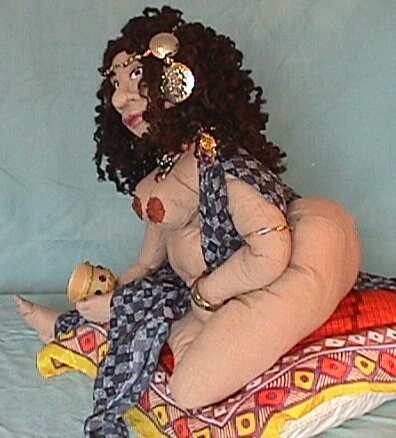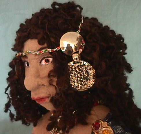 | She is made of cotton wearing a silk indigo print drape. Her hair is hand spun natural dark sheep wool I did years ago and knitted into an unfinished vest. Unravelled after 10 years it became beautifull kinky hair, just right for a North African Queen. |