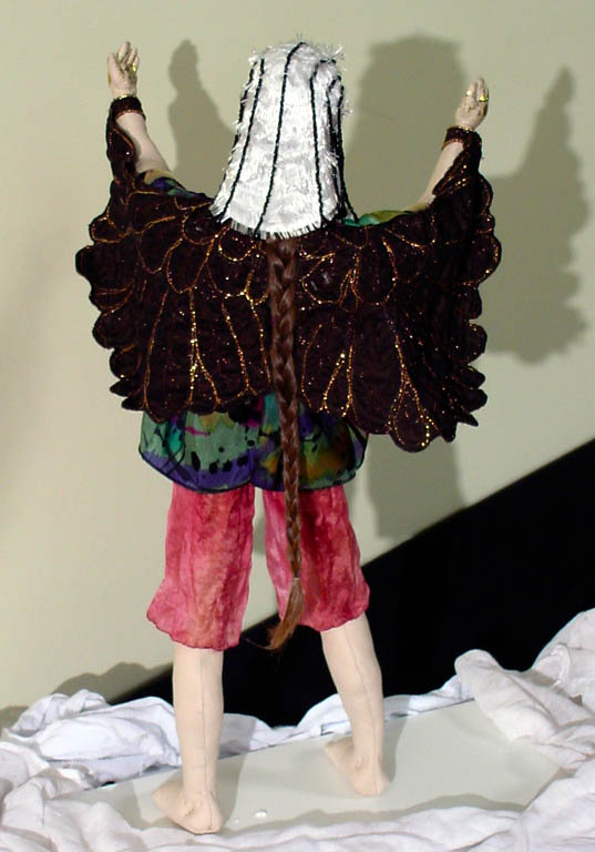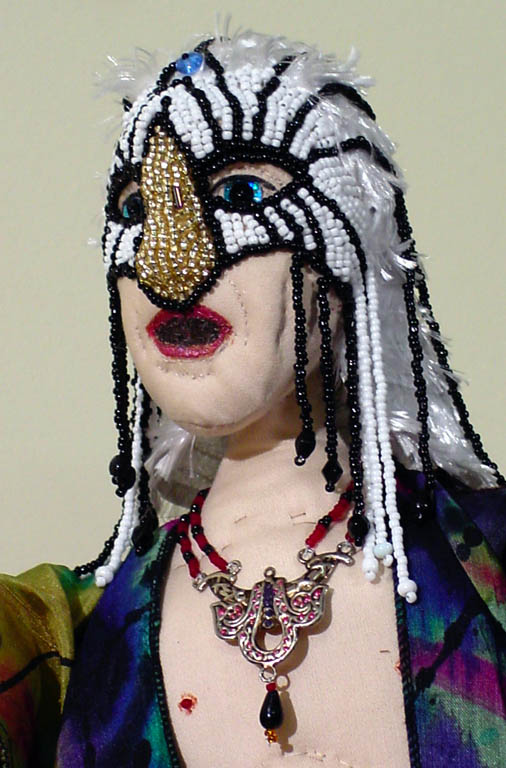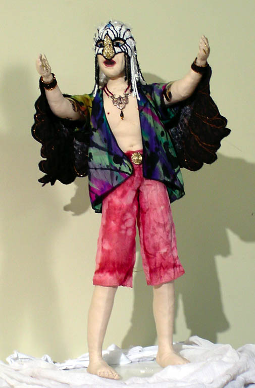 | Eagle Song stands about 15 inches tall. His body is constructed of cotton and poly cotton. His cloths are hand dyed silk, his cape is cotton and sheer polyester, free form stitched. His face wears a beaded mask and headress. His hair is human Click on the pictures for a bigger view. $495.00 Cdn plus shipping |