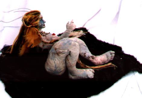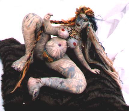 | This doll was created for the art show associated with the show "The Vagina Monologues" in Halifax nova Scotia on March 2, 2002. She sits 7 inches tall and is made from high quality quilting cotton. Her hair is made of assorted fibres and feathers and is decorated with bead work. |