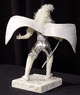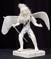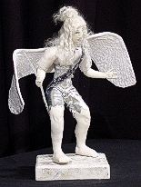 | The first of the full bodied young males. Sculputed from natural cotton, his hair is made from natural white mohair. His wings are several layers of cotton with iridecent white fabric over the cotton. The layers were free form embroidered by machine giving them their stiffness. He wear silver shorts and metal armour corselet with a fine shirt. Click on any picture to see an enlargement |