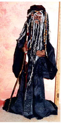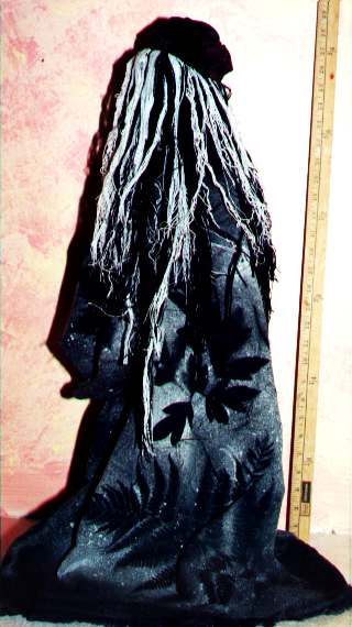The seeker is aproximatly 30 inches tall . For a closeup click on the picture. The seeker was inspired by the fabric of his robe. The black fabric was sprayed with bleach after leaves were laid on it to create a resist. He is a bathroom doll. He stands over a plunger which holds tiolet rolls.