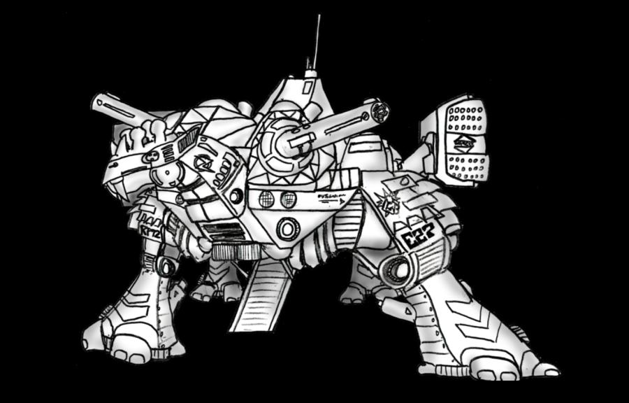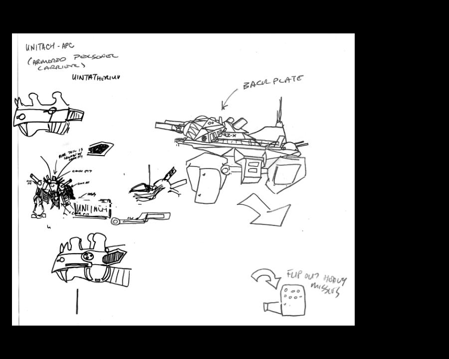| PRELIMINARY DOODLES FOR UNITACH TYPE: MY BASIC IDEA IS THAT THIS IS AN APC WHICH SEEMS TO BE SORELY LACKING IN THE ZOIDS WORLD. FINAL COLORS WILL BE ALL WHITE OR CREAM WITH RED, GREEN AND GOLD HIGHLIGHTS. THE DESIGN OF THE BACK ARMOR IS ATTEMPTING TO INVOKE A HINT OF DESIGN ELEMENTS FROM OLD JAPANESE TEMPLES. |