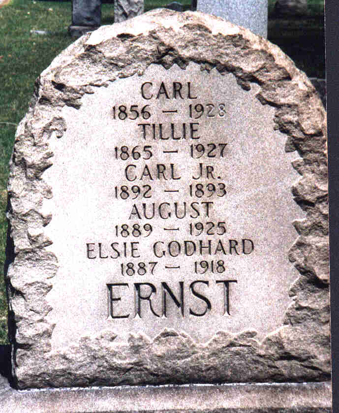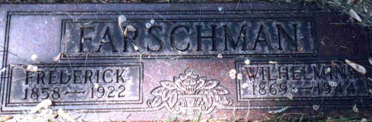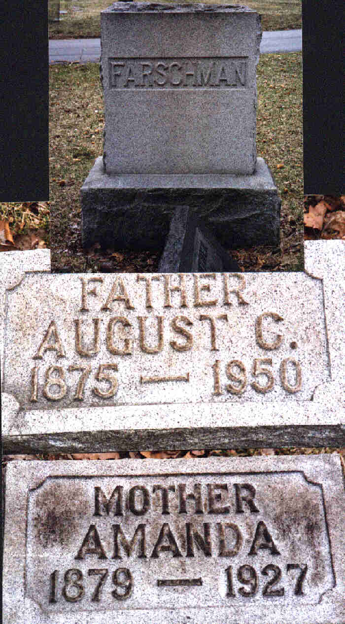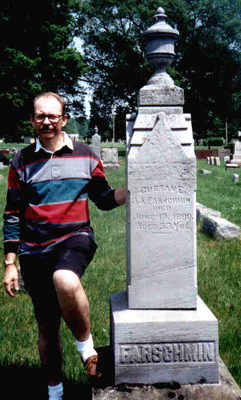 Farschmin, Gustave Julius August. Tombstone at Elmwood Cemetery, Lorain, Ohio. Apparently Eva Hass Farschman is also buried here and her name and dates were on one side of the tombstone. Standing beside his gggrandparents tombstone is Ted Steven Hiser.