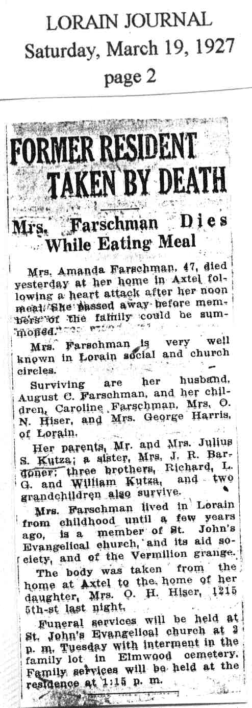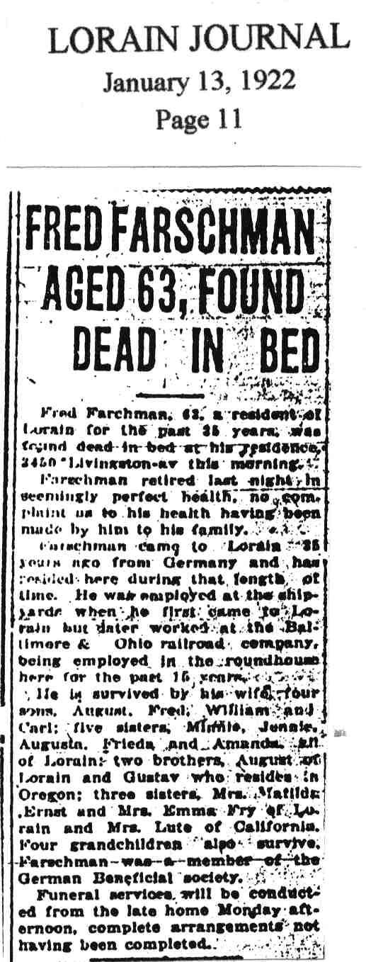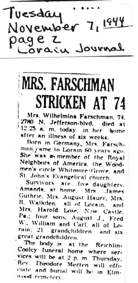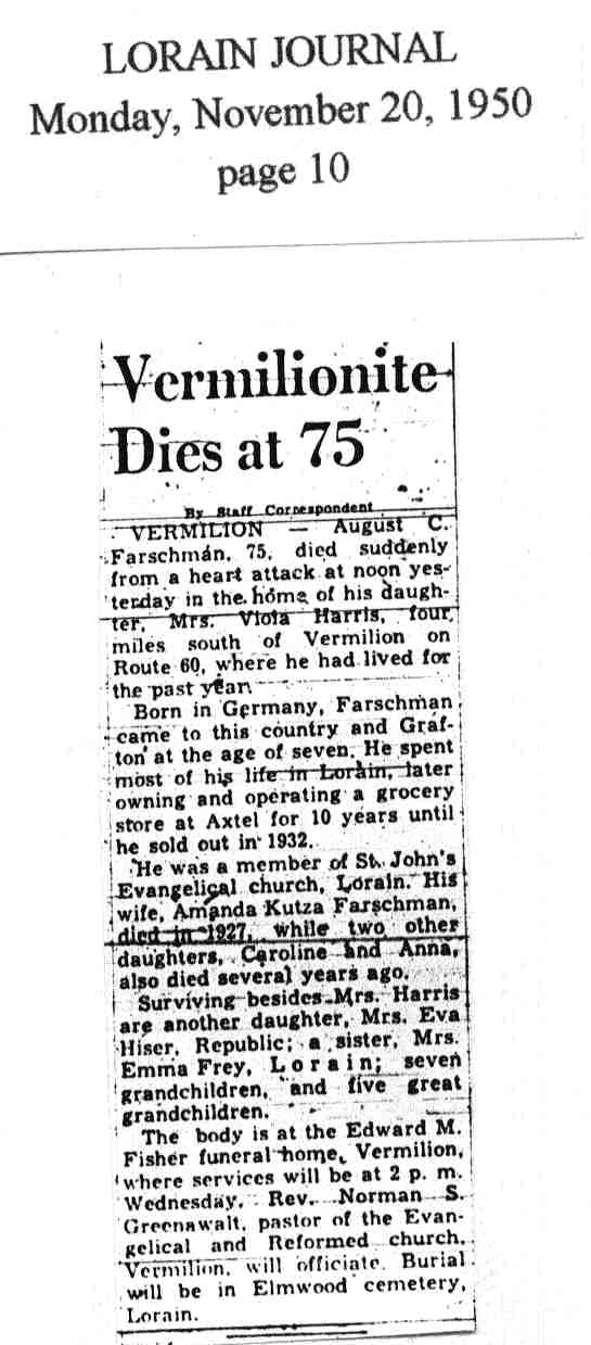 Harris, Viola Farschman. Obituary from the Journal, Lorain, Ohio, Sunday, January 18, 1981, page 46.