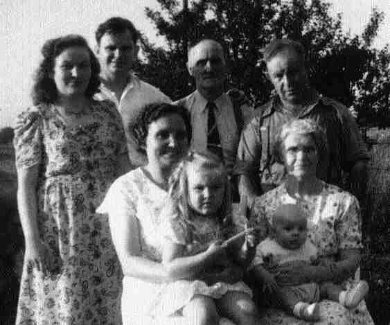 Helena Smith Hiser, Clarence Harold Hiser, Bill Nance, Orison Henry Hiser, Eva Matilda Farschman Hiser holding her grand daughter, Jane Claire Hiser, and Isabelle Smith Hiser Nance holding her great grandson, Ted Steven Hiser.