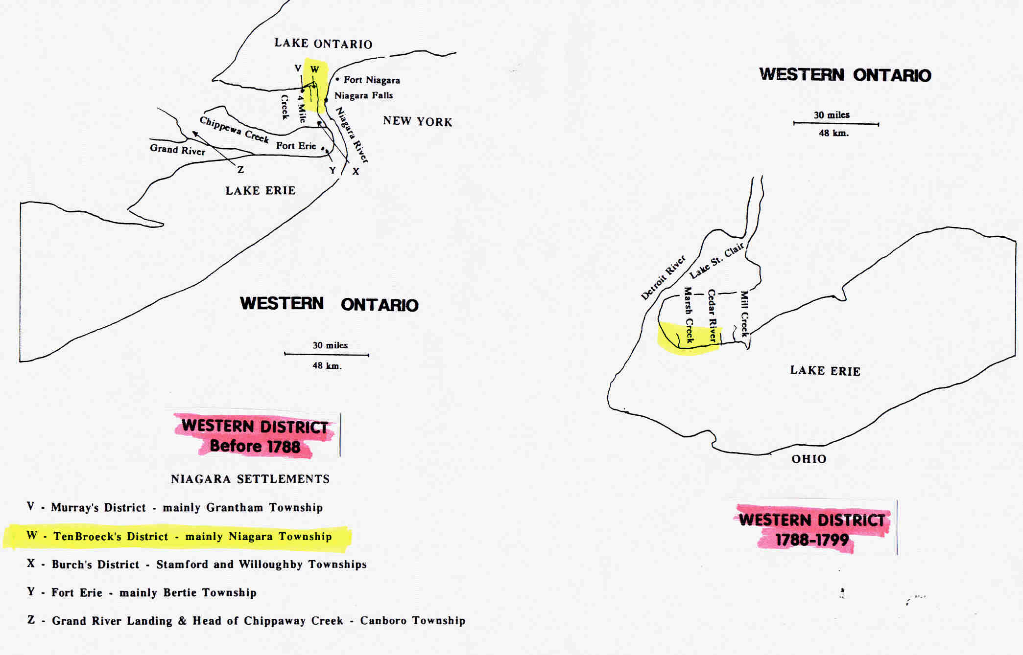 By October 1, 1787, Benjamin Knapp had removed to land west of Ten Broeck�s District to an area, �...on the North Side of Lake Erie from a Creek four Miles from the Mouth of the River Detroit to a small Creek about a Mile and a half beyond Cedar River--Detroit.� This area, still in Western Ontario, is closer to present day Detroit, Michigan. The Knapp home was located on Lot #66 and there were three children listed.